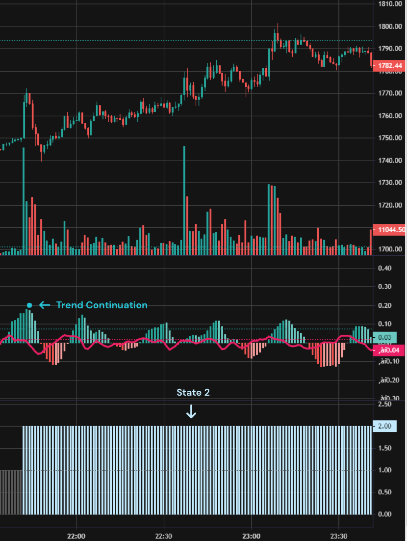 When the VSM model is in State 2, observe the AI Directional Strength Predictor histogram for high peak values. This suggests that the market may experience a continuation of the current trend, indicating a strong price movement.