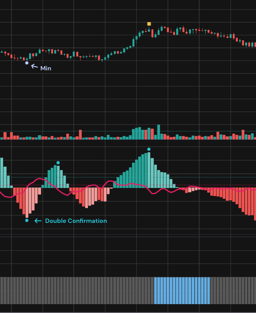 When the VSM model is in State 1, representing a low volatility market, pay attention to the occurrence of "min" points on the candlestick chart. A "min" point indicates a short-term support level within a 40-minute time frame. If, at the same time, the AI Directional Strength Predictor histogram becomes lighter and a circular marker appears, it can act as a "double confirmation." This suggests that the price is unlikely to break through the support level identified by the "min" point. Similarly, if a "max" point appears on the candlestick chart, it signifies a potential phase of resistance within a price range.