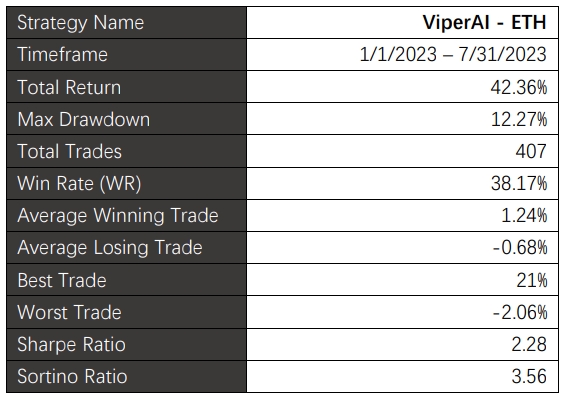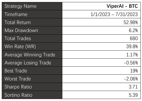 The equity curve below shows the data for ViperAI BTC and ETH pairs used together at 60% exposure each from 1/1 to 7/31:
