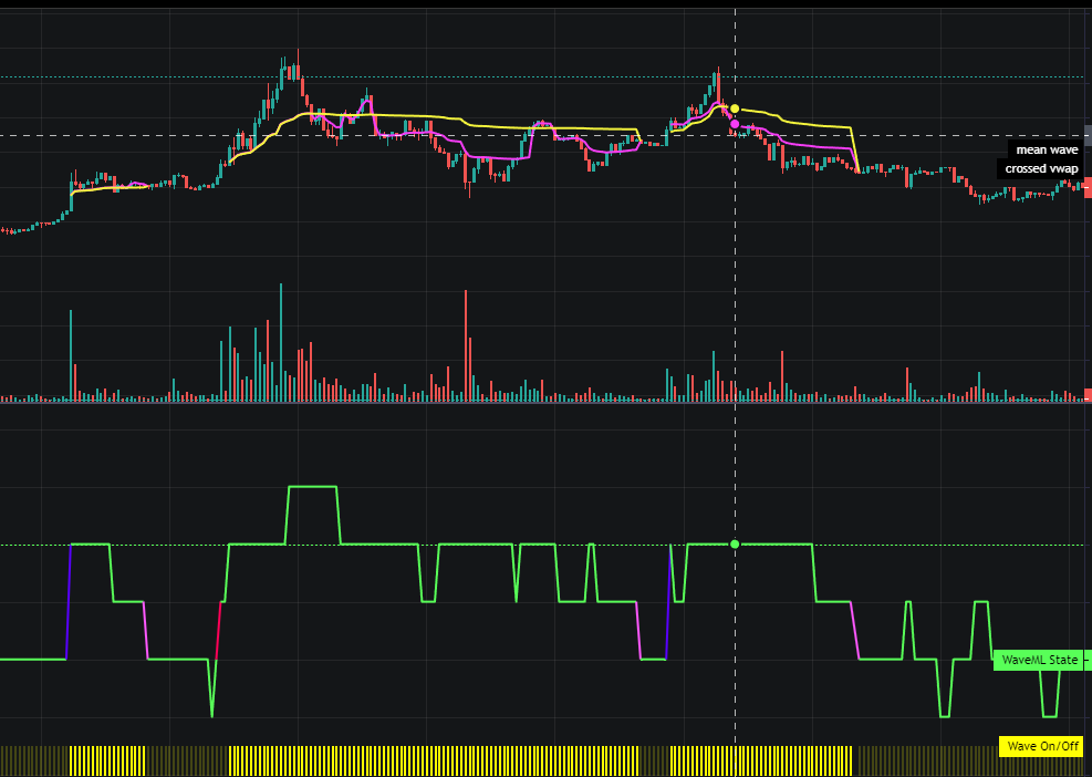WaveVWAP is a powerful price and direction reference tool leveraging the WaveML model. The WaveVWAP, depicted in yellow, is a variation of the VWAP that initiates its calculation three minutes before the market enters the Wave phase (Wave On) and continues until the wave concludes. A noticeable event occurs when the WaveVWAP crosses the OHLC (the mean value of Open-High-Low-Close) - this marks the launch of the WaveVWAPCross, displayed in pink. The WaveVWAPCross refreshes calculation from the moment the WaveVWAP crosses the OHLC and persists until the wave's completion. These two indicators serve as valuable reference lines in tracking trend developments.